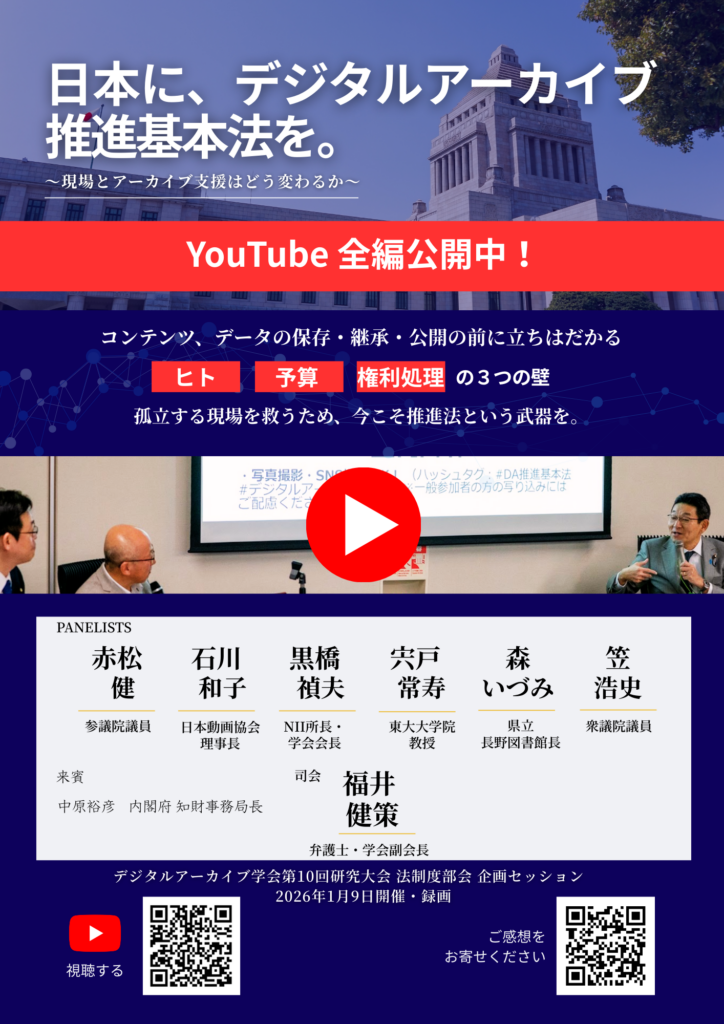 [デジタルアーカイブ学会 第10回研究大会・企画セッション「デジタルアーカイブ推進基本法は現場とアーカイブ支援をどう変えるか」] (2026/1/9)